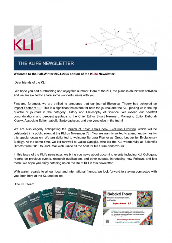 We are thrilled to announce that our journal Biological Theory has achieved an Impact Factor of 1.9! Our heartfelt congratulations and gratitude to the Chief Editor Stuart Newman, Managing Editor Deborah Klosky, Associate Editor Isabella Sarto-Jackson, and everyone else in the team! We also eagerly anticipate the launch of Kevin Lala’s book Evolution Evolving. We are delighted to welcome Barbara Fischer as Group Leader for Evolutionary Biology. At the same time, we bid farewell to Guido Caniglia, who led the KLI wonderfully as Scientific Director from 2018 to 2024. We wish Guido all the best for his future endeavours.