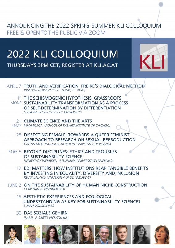 Speakers include Giuseppe Feola (Ultrecht), Mika Tosca (Art Institute of Chicago), Caitlin McDonough-Goldstein (Vienna), Henrik Von Wehrden (Leuphana), Kevin Laland (St. Andrews), and KLI fellows Christian Dorninger, Luana Poliseli, and Isabella Sarto-Jackson.