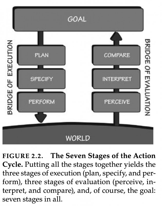 If you pick up Donald A. Norman’s famous book "The Design of Everyday Things," you will find a remarkable model outlined in Chapter two. It depicts a circular flow between an individual's goals and the world. This model starts with a prior goal, which informs actions, followed by perceiving and interpreting changes in the world, and finally, comparing the action outcome with the initial goal. Good design makes this iterative flow between goals and observable effects as smooth as possible: objects we use everywhere in our built human niche environment should "speak" to us about how to best interact with them.